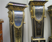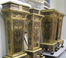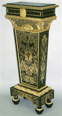 ![]() | 2006 Kopie eines Postaments in Boulle-Technik. "Contre-partie" in Schild-patt, Horn, Messing und Zinn (links im Bild) Original rechts: André-Charles Boulle zugeschr., Paris, ca. 1730 Planung und Ausführung: Dipl.-Rest. Irmela Breidenstein, Berlin Technische Zeichnung: Dipl.-Ing. Franz Fritsch, Baden-Baden Gravur: Lothar Rasch, Berlin Guß: Gerd Karsch, Leipzig Staatl. Kunstsammlungen Dresden, Grünes Gewölbe |