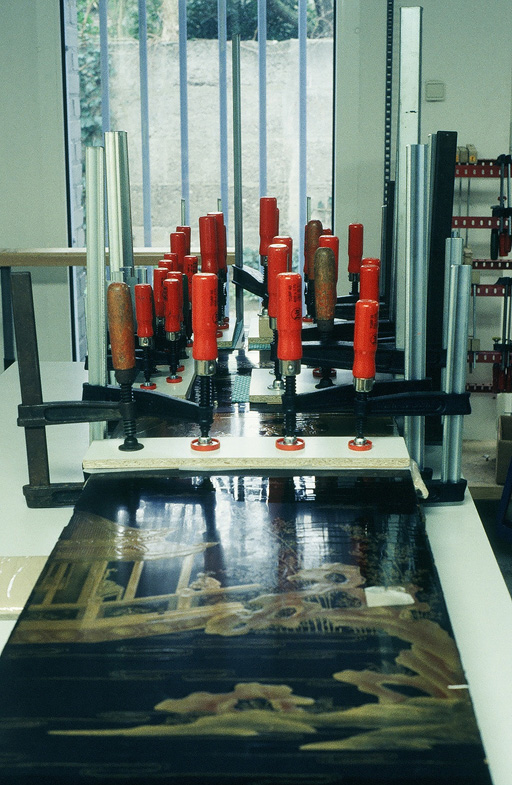 The lifted lacquer lamina on the screen tended to return to their former position after cooling and drying. The tensile forces involved are considerably higher than in the case of, say, veneers. Thus with all types of adhesive tested on the screen we used heated boards and clamps (10) to set the loose lacquer. We used an intermediate layer of Chromatco paper, which absorbs extruded adhesive and is permeable to water vapour.