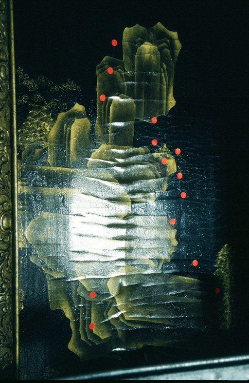 In a way we can call it a preliminary exercise for the upcoming restoration of the Lacquer Cabinet in Schloß Falkenlust. Here we were faced with the same kind of damages. Due to unfavourable climatic conditions the lacquer layers, especially of the gold paravent, showed quite dramatical, extensive delaminating and cracks. In this case we had to work in situ and vertically, what meant that the use of clamps was not possible. We couldn't put too much pressure to the panels because they were thinned to about 8 mm thickness and very sensible. Also we had to use an adhesive that would stay in place and not run down the walls. Preliminary securing attempts assured us that in this case, too, our starch-and isinglass- paste was a practicable binding medium. In Falkenlust we didn't have to apply an isolation film because the asian lacquer was covered with a very thick layer of an old mastix varnish. So we lifted our infrared lamp onto the scaffold and began to work. The climatic conditions were very good during the summertime, so that the adhesive could dry rather quickly within one or two days. After drying we could lay down the layers with a heated spatula. This method showed very good results, even when some of the cracks reopened after some weeks. The operation could be repeated and the lacquer layers refixed. (13)