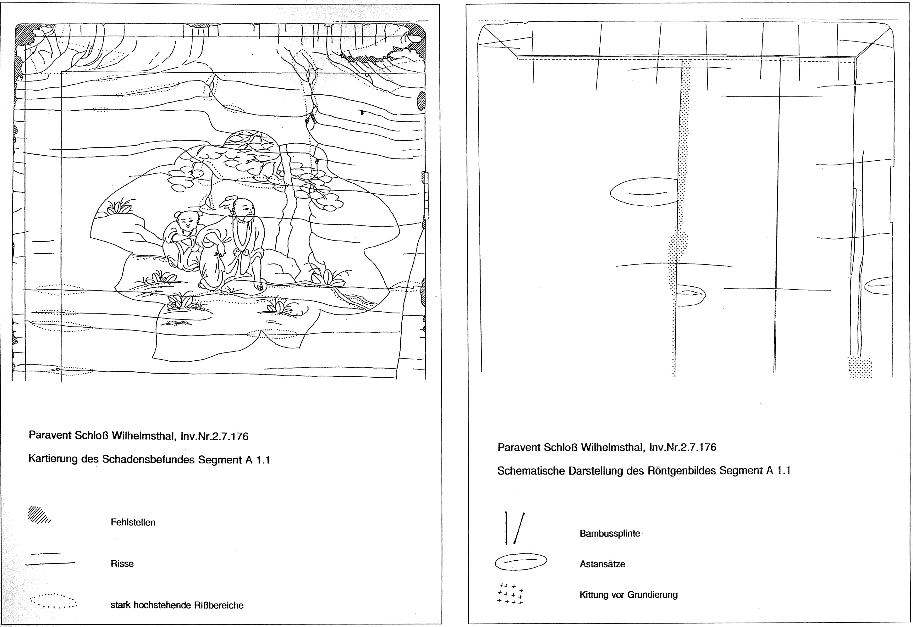 6. Detail Paravent vor der Rstaurierung | 7. Schadensbild und Unterkonstruktion | 8. Schematische Darstellung der Schollenbildung |
