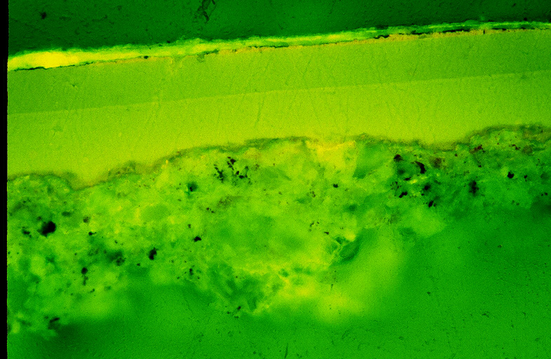 In order to be able to assess the depth of penetration, permeation behaviour and distribution of the adhesive under the lamina we dissolved the adhesives in non-ionic- iodisized salt solution and put it under x-ray (11) after drying.